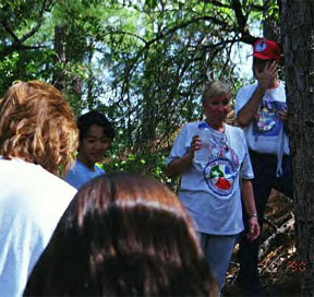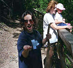 Mallory was trying to scare me with a catapillar. Carol and Lenore were enjoying the overlook of the Colorado River. |
